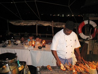 船頭で初老のサリムさんは出発早々、こちらが尋ねてもいないのに「このダウに乗るのを怖がる観光客も多い。でも、これまで25年、何もトラブルはなかったし、一度も沈没したことないから大丈夫だよ」と自信満々に語るので、「え? みんなは乗らないものなのか」と逆に少し不安になりました(汗)。 モンバサの海はエメラルドグリーンの色に輝き、とてもきれいでしたが、すごく遠浅で、余りに浅すぎてダウが何度も座礁しそうに。 サリムさんは途中、大きなウニや、赤と灰色のウルトラマン模様のヒトデ(ちょっと日本では見なさそうな…)、タコの赤ちゃんなどを捕まえてくれ、子供たちは大喜び。夫は「醤油とワサビ~」と叫んでいました。