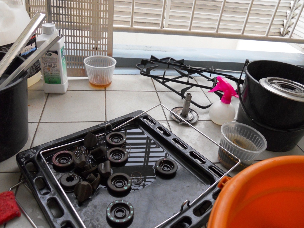 「油が詰まって、汚れてるねー。明日、このオーブン全部洗いましょうか?」
