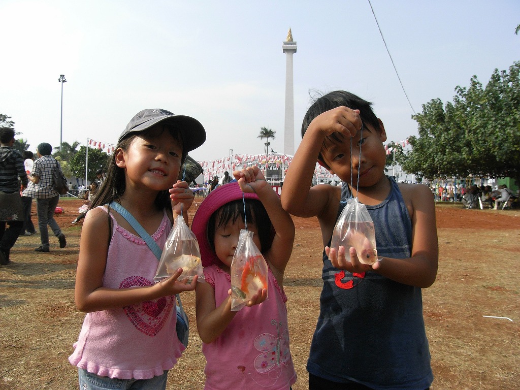 インドネシアの子供も大人も夢中になってすくっているのですが、よく見ると、みんな、金魚すくいの紙はもう破れているのに、プラスチックのカップで水の中をグルグルかき混ぜて、すくっていました(苦笑)。さらに、直接、手で捕ろうとする人も多くて、2度びっくり!