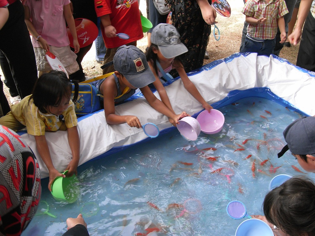 会場を一周して、ついに、テント横に人だかりを発見! のぞいてみると、小さなビニールプールの中に、あっと驚くような巨大金魚がわんさかいます。日本風の和紙が張られた金魚すくいでは、ぜーったい、すくえないような大物ばかりです。