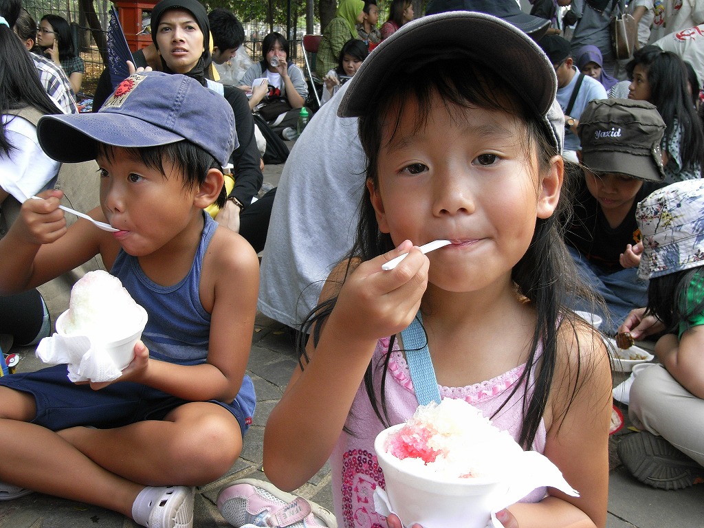 子供達はすごく楽しみにしていたのですが、会場にはあまりにも人が多く、その上、ものすごく暑いので、到着してすぐにバテ気味。飲み物、かき氷、たこ焼きを買って、地べたに座り込んで休憩しました。会場の中央にテントもあったのですが、ものすごい人だかりで、座る余地がないのです。