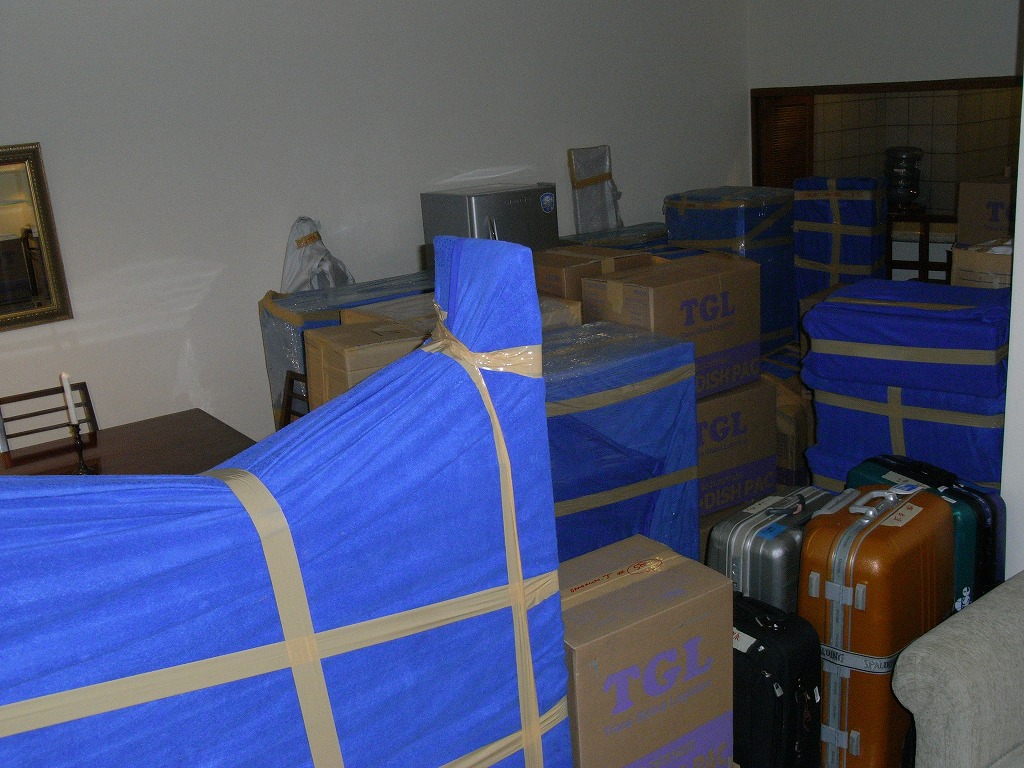 (写真上・・・荷物でぎゅうぎゅう、新居のリビングルーム)