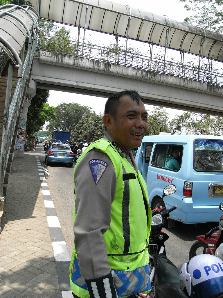 もしも、人気のないところでタクシーが停まったら最悪ですが、交通渋滞の真ん中でぽつんと降車するのも、嫌なものです。 (写真・・・優しい笑みでタクシーを止めてくれたお巡りさん。左後ろにはエンジンが止まってしまったオンボロタクシーが)