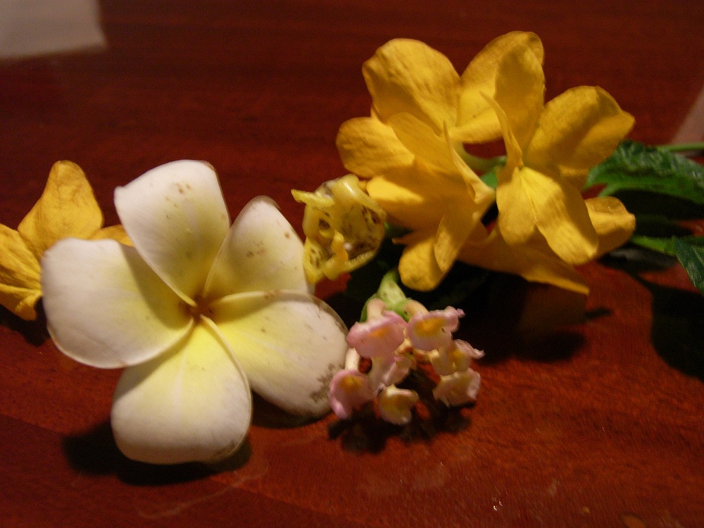 写真は、毎日幼稚園から戻ると、お散歩に出かける長女ネネ(6才)と次女ナナ(4才)が拾ってきた花々です。(写真左)