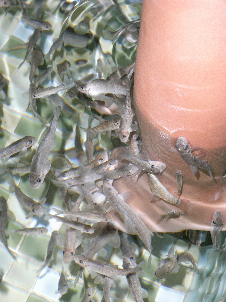 足の先が水に触れた途端に、ものすごーく小さくてたくさんの魚ちゃんの口が足の隅々まで吸いついてきます。たまらず、ゆっくり足を上げると、水面上まで強力に吸い付いたままのお魚もいます。すごい勢い~!