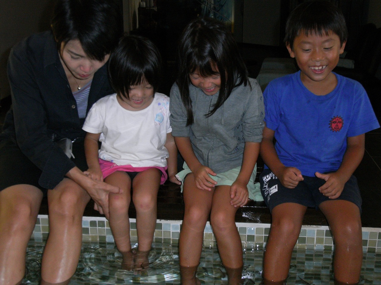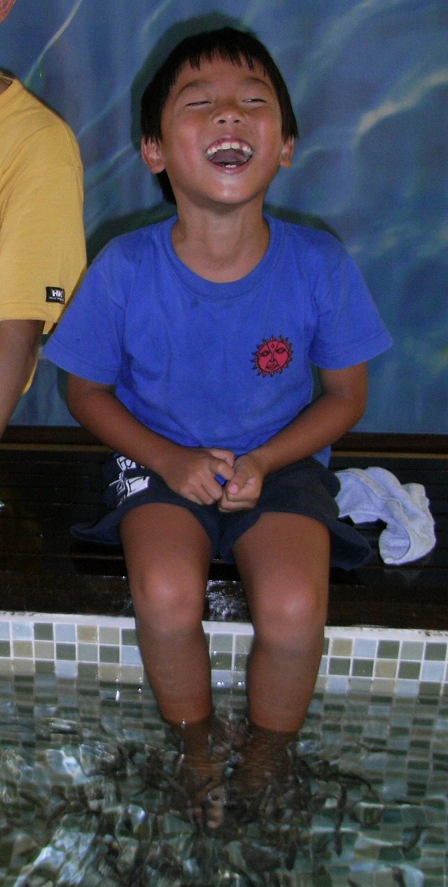 家族みんな、初めての感触に、最初はキャーキャー大騒ぎしてましたが、だんだんと慣れてきて、足の指を広げてみたり、じっくり魚の顔を見つめたり…。終わってしばらくは胸がどきどきしていました。はぁ~面白かった!
