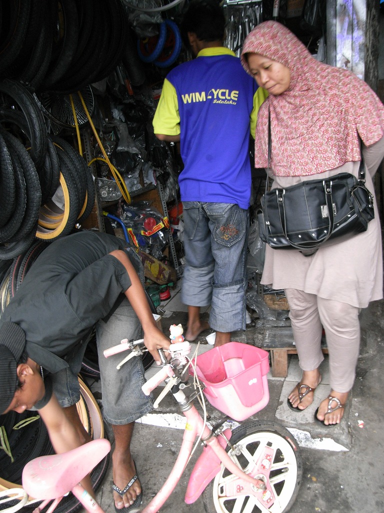 自転車屋さんでタイヤの空気を入れてもらい、ブレーキのチェックなどをしてもらいました。費用は5000ルピア(約50円)でした。ちょっと高いな~と思ったけど、ま、いいか。