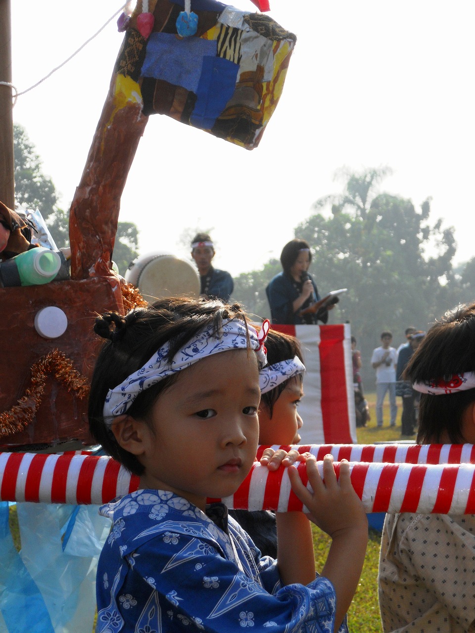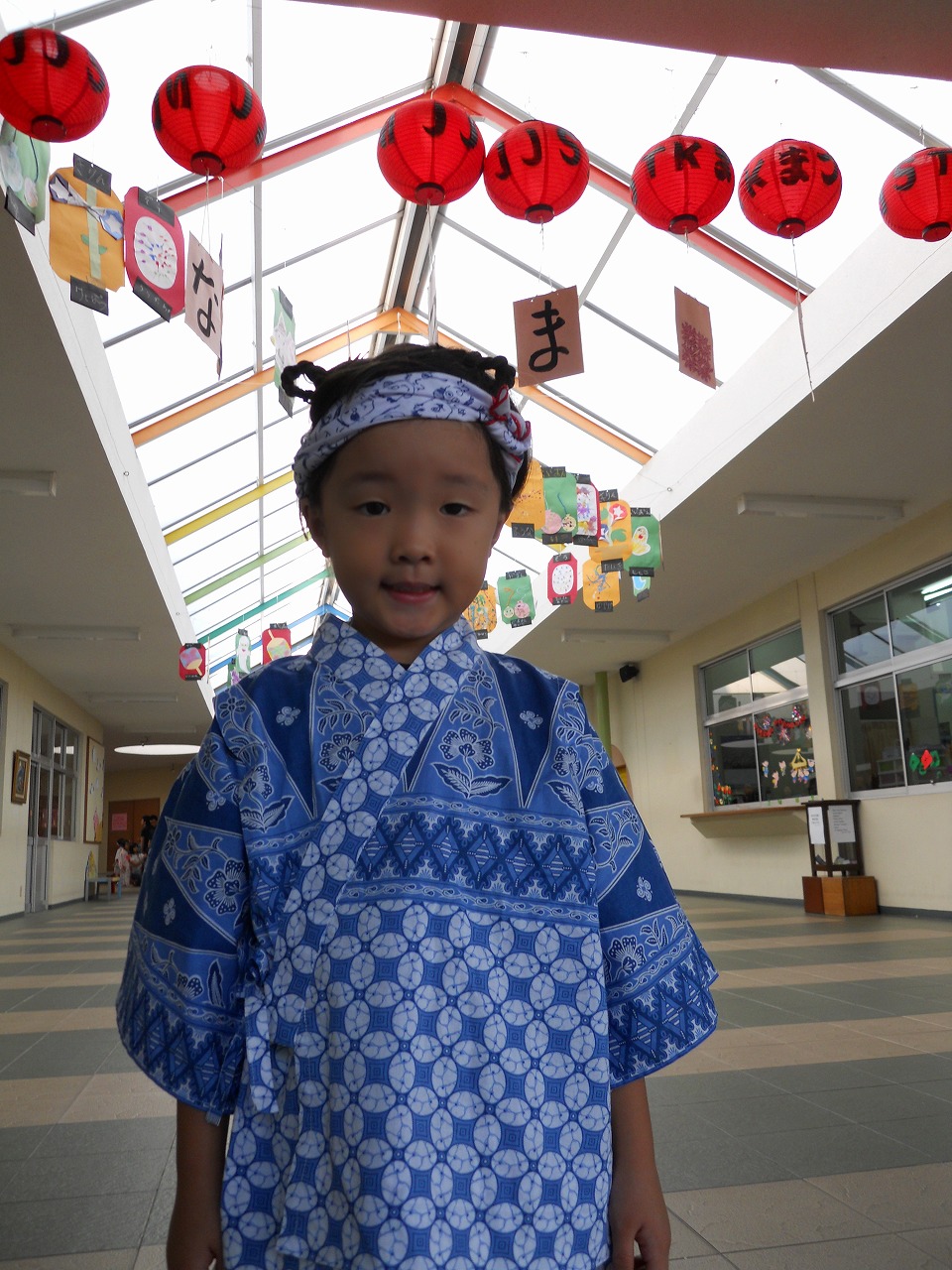 オープニングは、同じ敷地内にある、中学部の校庭で行われました。園児達手作りのお神輿を担いだ後、親子で踊ったのですが、朝にも関わらず、容赦ない日差しで暑くてたまりませんでした。日差しから逃げるように、建物の中に移動して、「縁日ごっこ」をしました。
