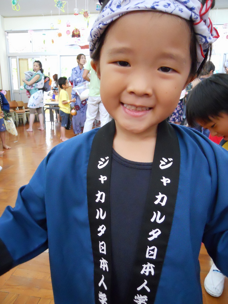 ←胸に「ジャカルタ日本人学校」と書かれ、後ろに「祭」と書かれた、年長さんだけが着られる憧れのハッピ。