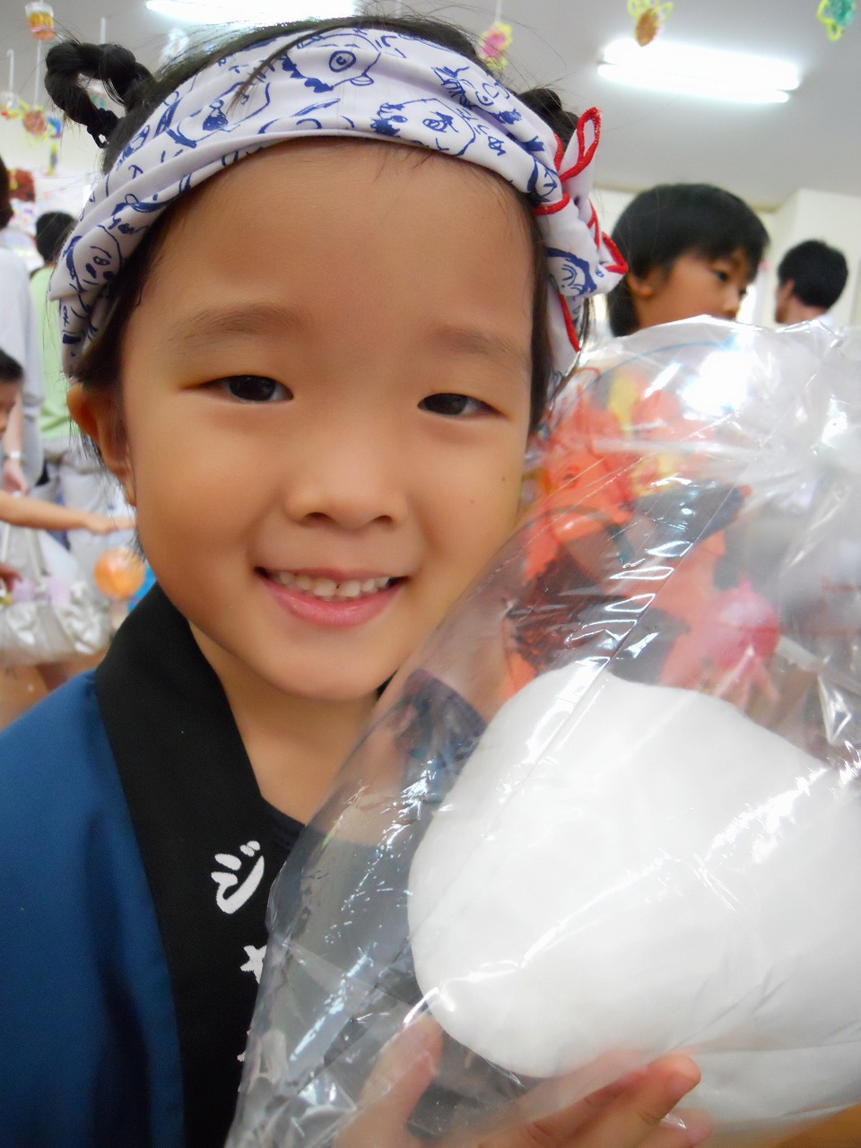 ポップコーン、綿あめ、ミニパン、ヤクルトを年少さんが担当するお店でもらって、年長さん手作りのゲームやお化け屋敷で遊びます。