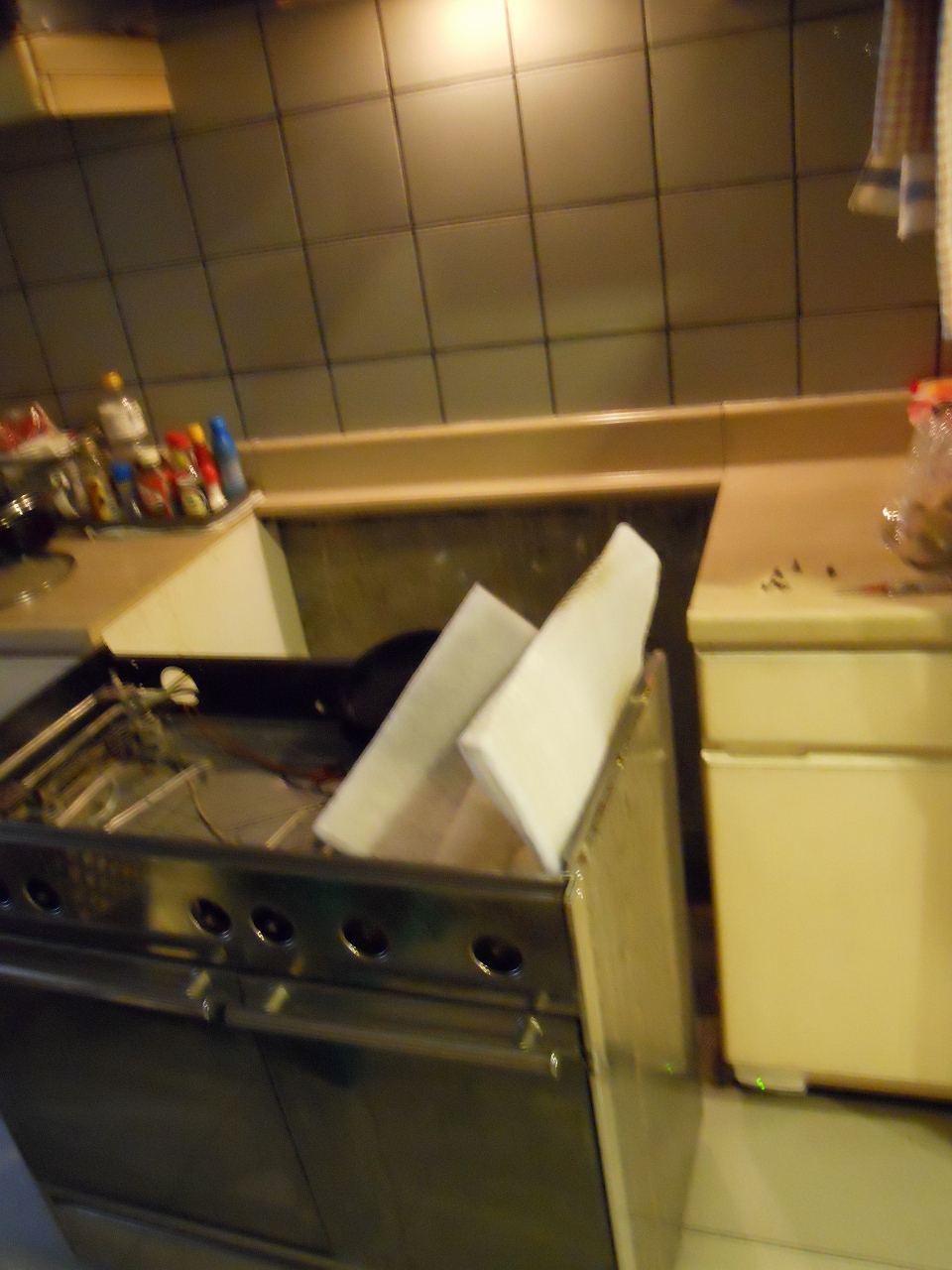 「油が詰まって、汚れてるねー。明日、このオーブン全部洗いましょうか?」