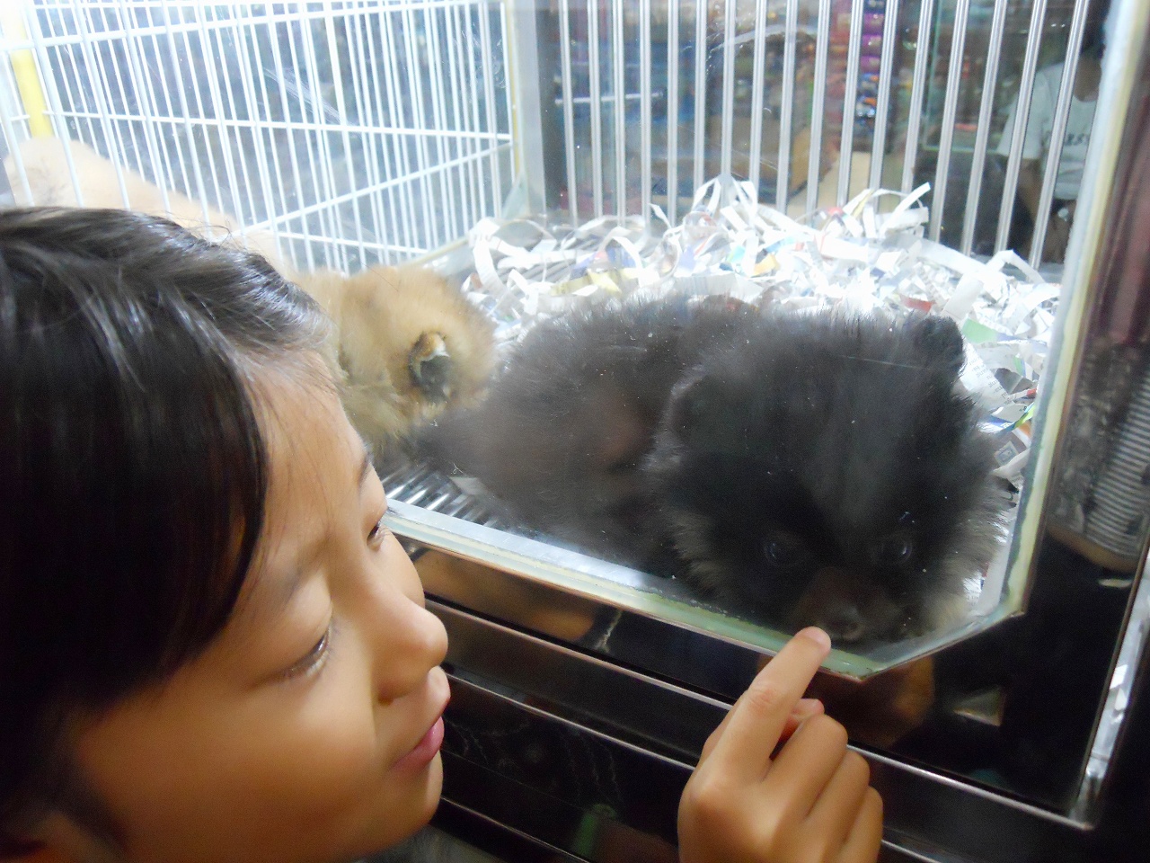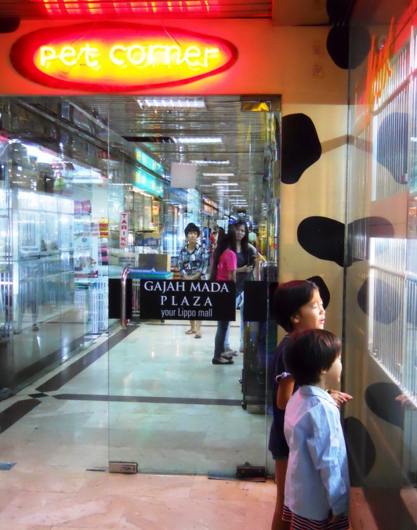 きっかけは、犬が大好きな長男ハル(10才)長女ネネ(8才)次女ナナ(5才)の為に、インドネシア人の知人クリスティンさんが「ペットショップならガジャ マダ プラザが楽しいわよ」と教えてくれたことからでした。2階のフロアの一角がペットショップコーナーになっていて、20件ほどの店が連なっています。私はヨークシャーテリア好きなのですが、子犬はいなくて、かなり大きめの成犬2匹がいました。種類はポメラニアン、ビーグル、チワワ、チャウチャウ、シェルティ、パグなどがいて、中でも、ポメラニアンは人気があるのか、複数の店に子犬がいました。