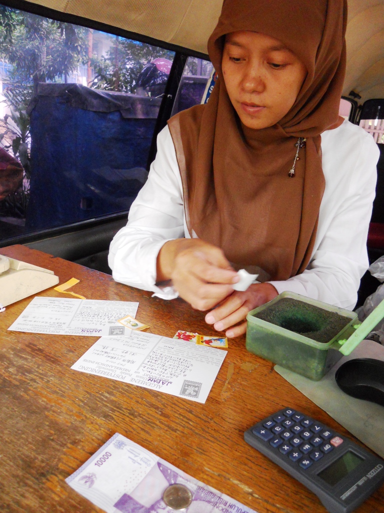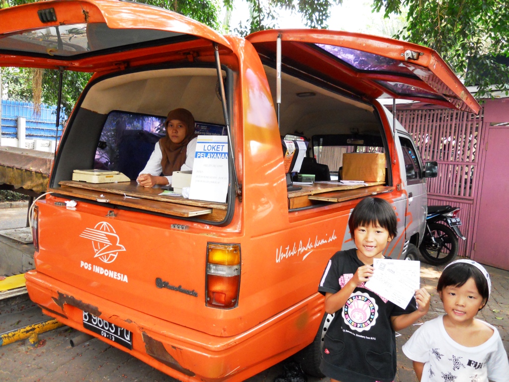 ジャカルタ名物の大渋滞を覚悟して車で郵便局まで出かける必要がないので、移動式郵便局はとても重宝しています。それに、移動式だなんて、なんだか郵便屋さんごっこのように、のどかで気に入っています。