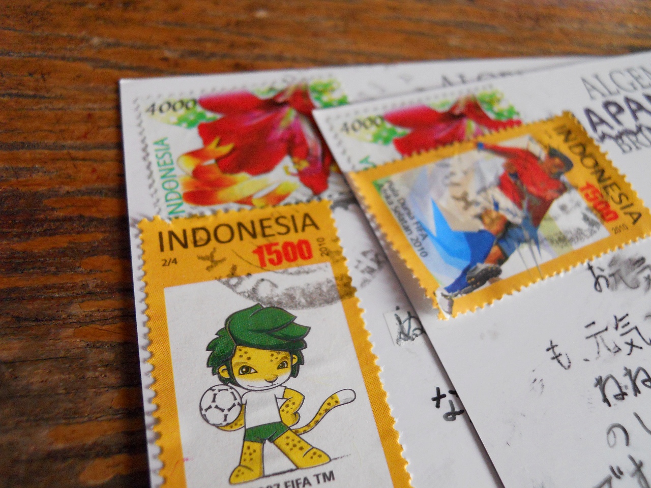 「郵便局か~!いい機会だから日本にお手紙書きましょう!」。 私達が普段利用しているのは、近所のスーパーHEROの敷地内にやってくるワゴン車の移動式郵便局さんです。ワゴン車のトランク部分と側面に特製の受付があります。月曜~金曜(AM9:30~PM1:30)で、オレンジ色のワゴン車が目印です。ちなみに、国際郵便のハガキは5,500ルピア(約55円)。切手もサッカーのイラストで、かわいらしいです。