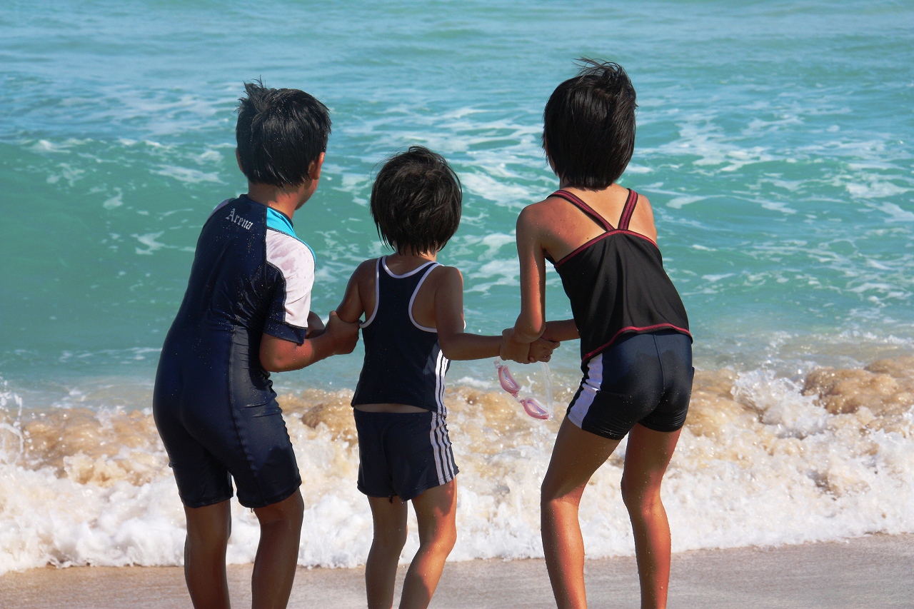 ↓長男ハルと長女ネネが両脇に、次女ナナの手をしっかり握って、「(波よ)来~い!」(ちょっと逃げ腰)。