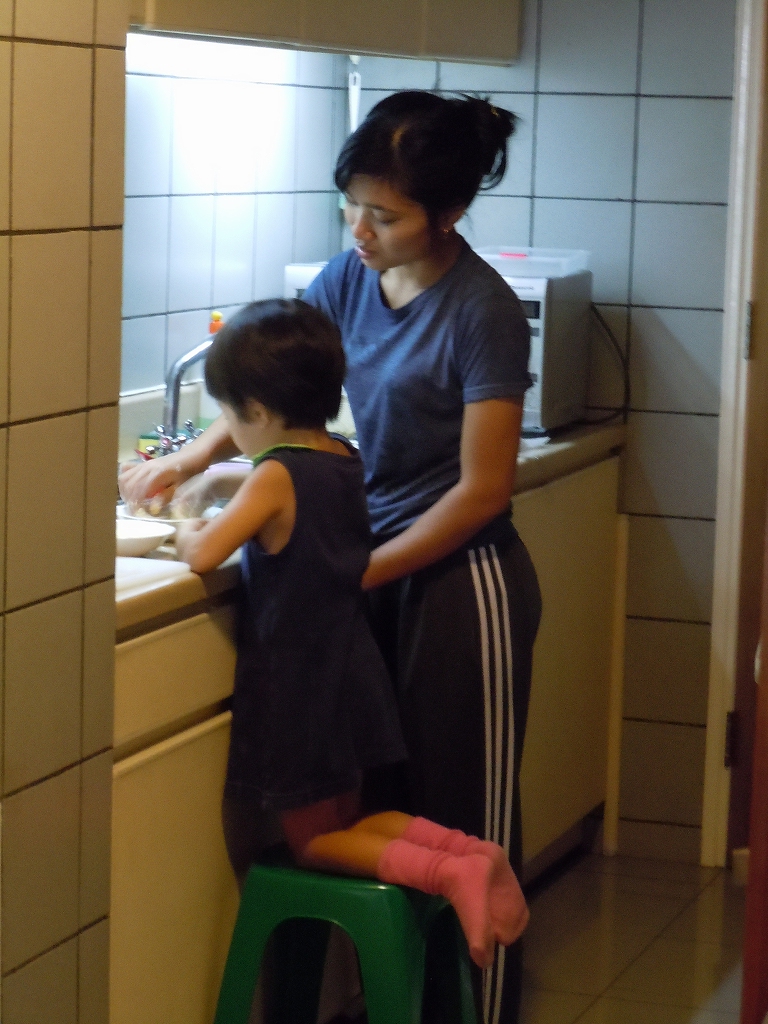 月曜~金曜の朝10時から子供達が戻ってくる夕方4時まで、部屋の掃除、洗濯、アイロンがけ、夕食を作って帰ります。日本食も丁寧に作ります。常に手抜きを心がけてる私の料理より美味しいくらいです。たまに豚肉に触れることさえ嫌がる人もいるムスリム(イスラム教徒)ですが、彼女は豚肉料理も作ります。ただ、味見だけは出来ないので「Mom,tolong coba(ママ、味見してみて)」とスプーンを持ってきてくれます。