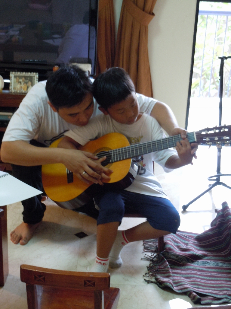 音楽スクールに通うとなると、車で、しかも私が同行しないといけなくて大変なので、自宅に来てくれる先生を探しました。ネットで見つけた先生はフレンドリーなインドネシア人の男性、ヘンリー先生です。メールでコンタクトして面接をしました。礼儀正しく、英語も話せるのでお願いすることにしました。夫も私も楽器のことは何も分からないので、購入する時には先生と楽器屋さんで待ち合わせをして一緒に選んでもらいました。余談ですが、インドネシアでは少数派の「クリスチャン」なので、おやつにポークハム入りのサンドイッチを出しても大丈夫です。